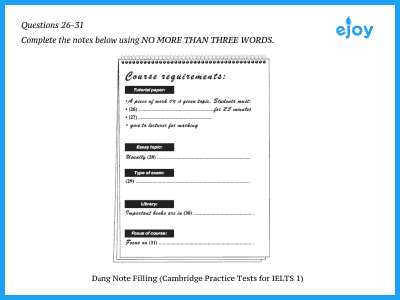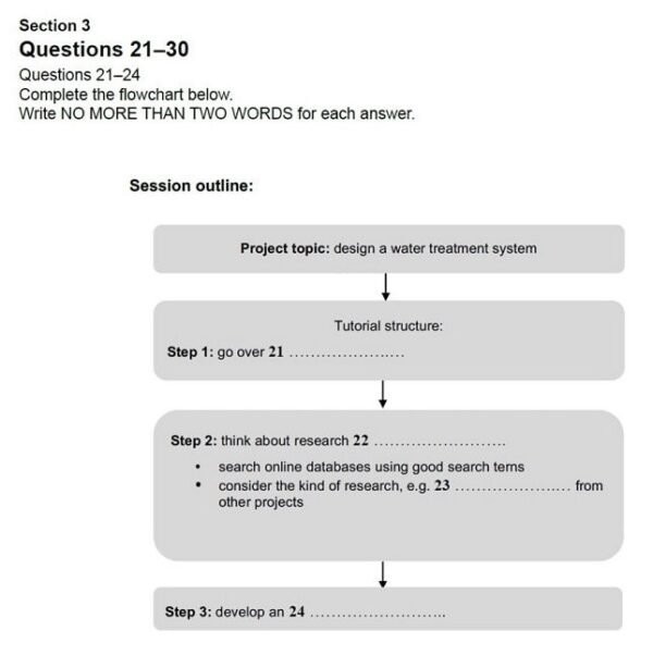 This kind is related to completing a plan (e.g. of a factory), a map (e.g. of a state area), or an image (e.g. a part of a device). There will be some answers to select. The content of the listening recordings is mostly non-academic. In many cases, the candidates are provided with an introduction about an event or about the structure, or the plan of a building (for example a trip to a museum, gallery, school…)