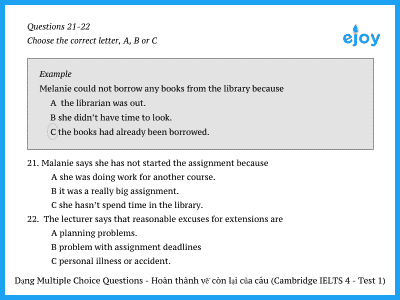 The second kind of IELTS Listening consists of Completion of Sentence – Multiple Choice Question. The starting of the sentence follows a question with 3 possible answers. The students need to choose any 1.