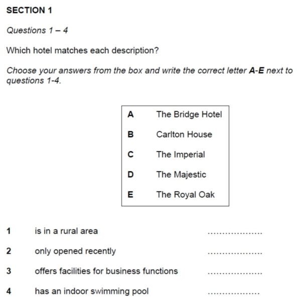 The candidates have to match a numbered list of items from what they have listened in the listening audio to a set of options on the question paper. The set of options might have some criteria of some kind.